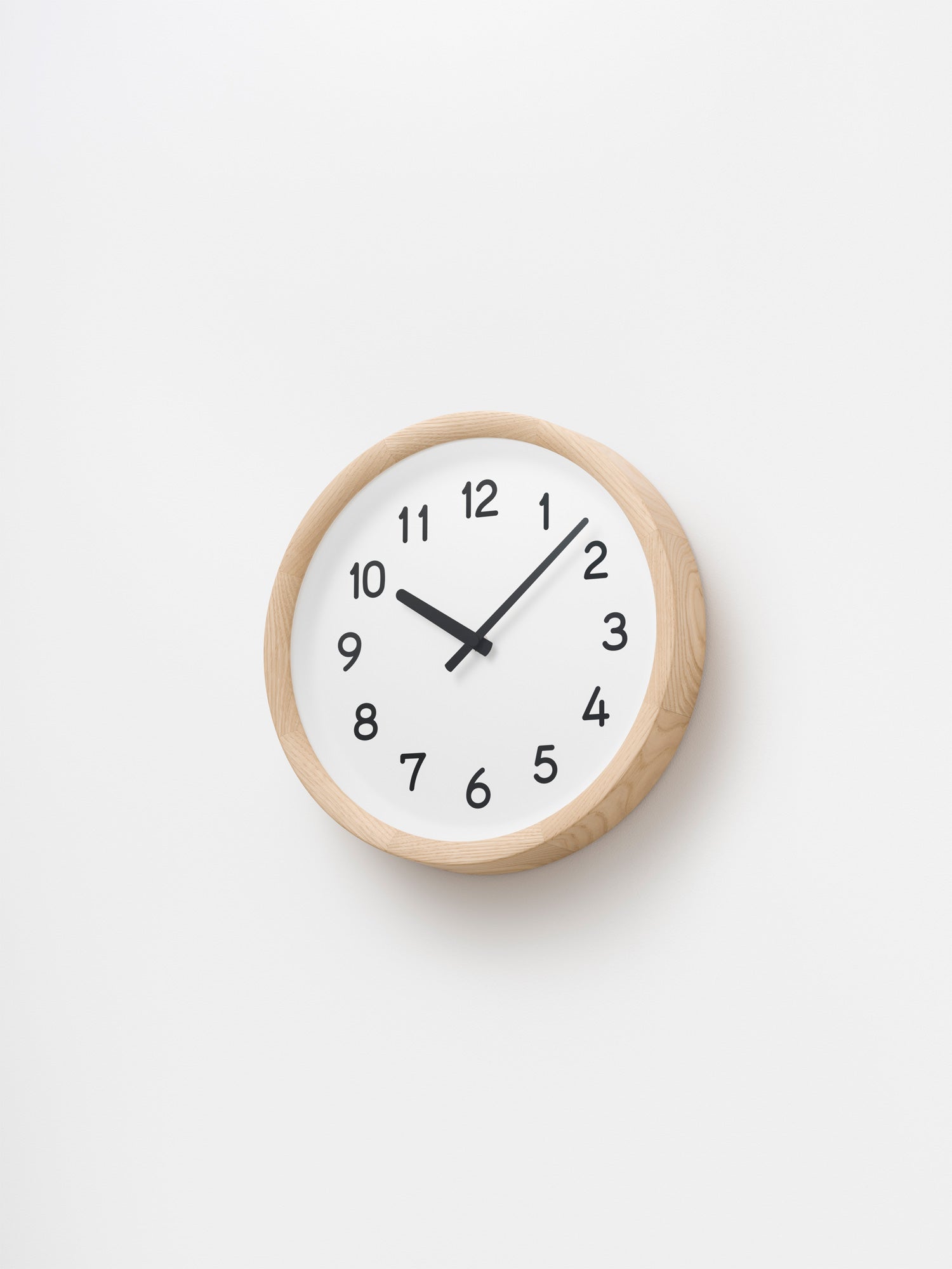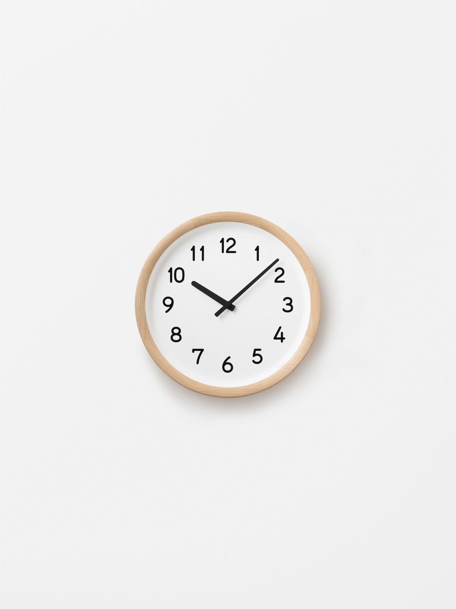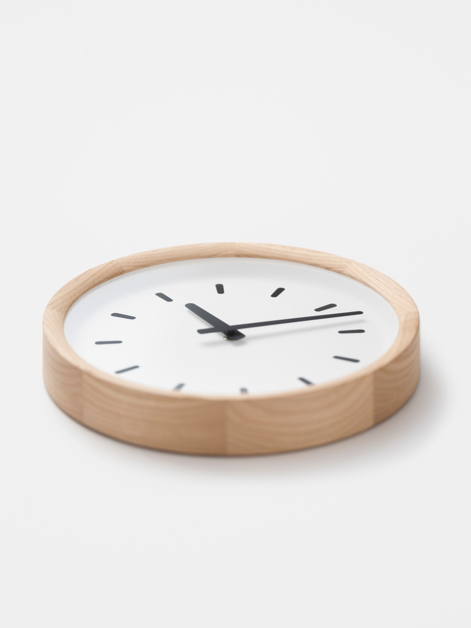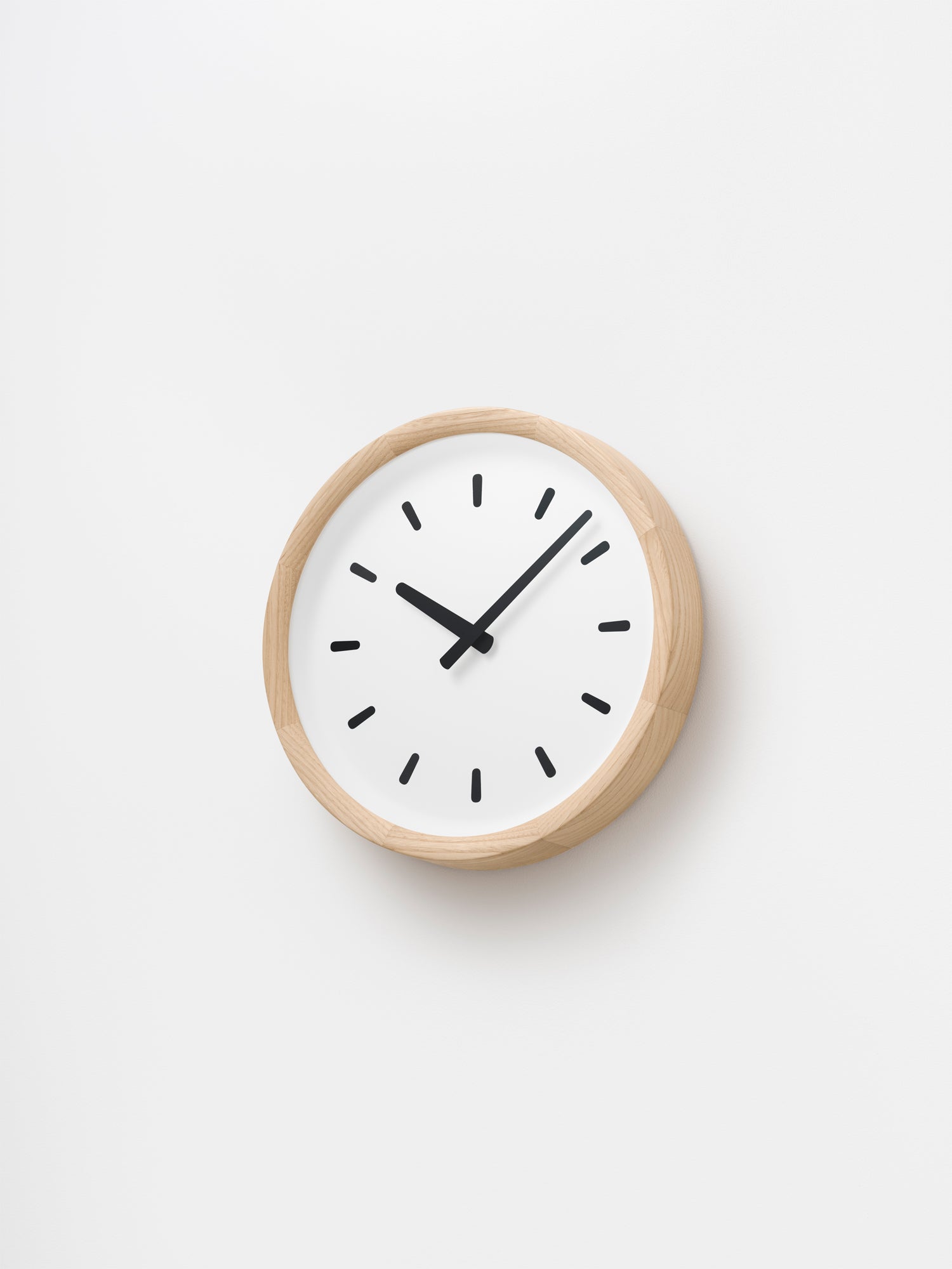 The face rising gently toward the wooden frame has a wide margin, and the frame does not block the hands and indicators, even from an angle, which makes the clock easy to read. The bowl-like shape of the clock has a sense of unity, enhancing the hands and indicators while creating soft shadows in the ambient light.