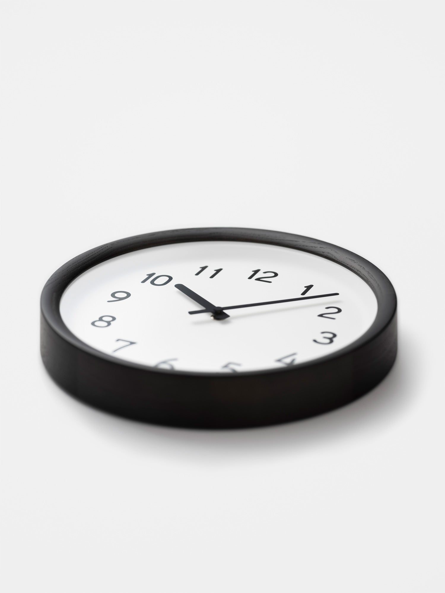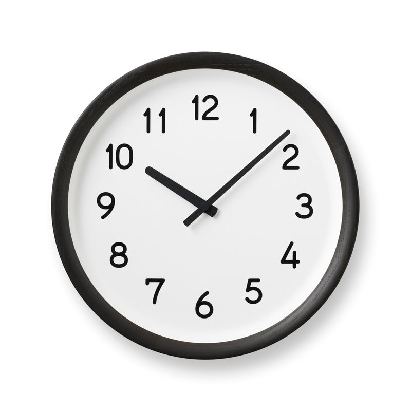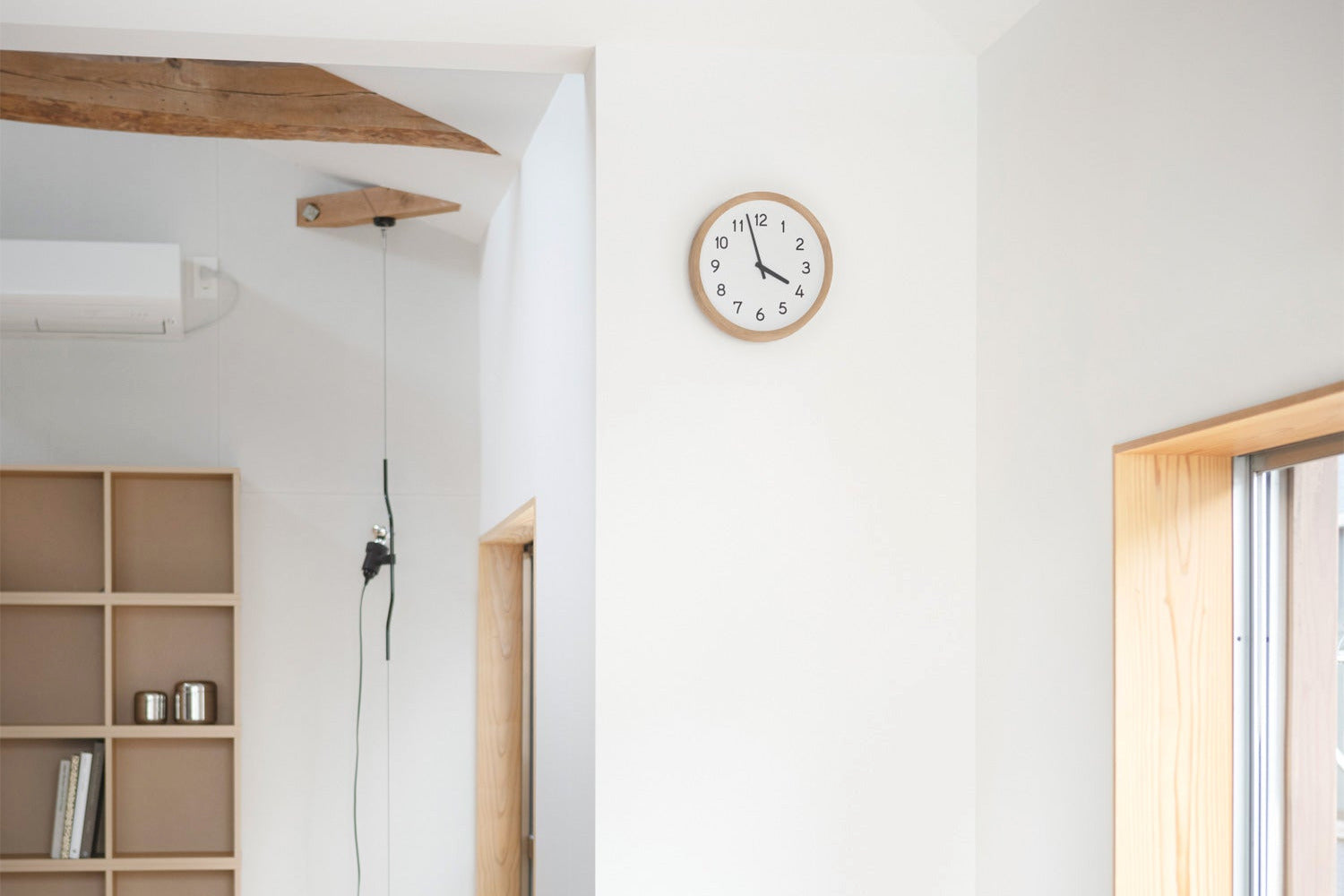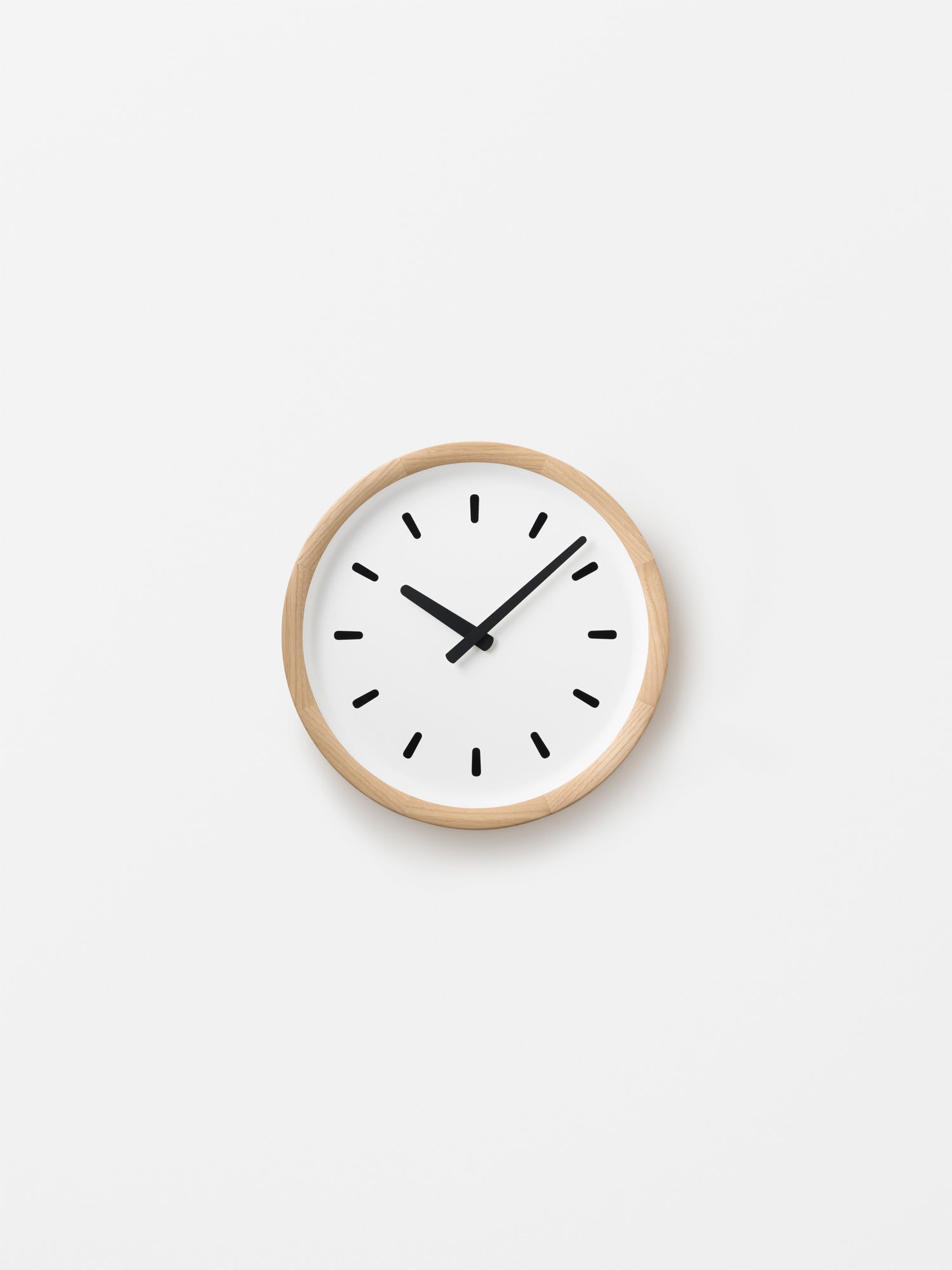 The face rising gently toward the wooden frame has a wide margin, and the frame does not block the hands and indicators, even from an angle, which makes the clock easy to read. The bowl-like shape of the clock has a sense of unity, enhancing the hands and indicators while creating soft shadows in the ambient light.
