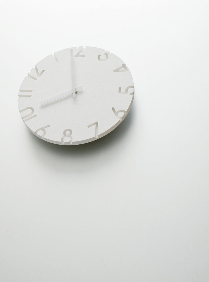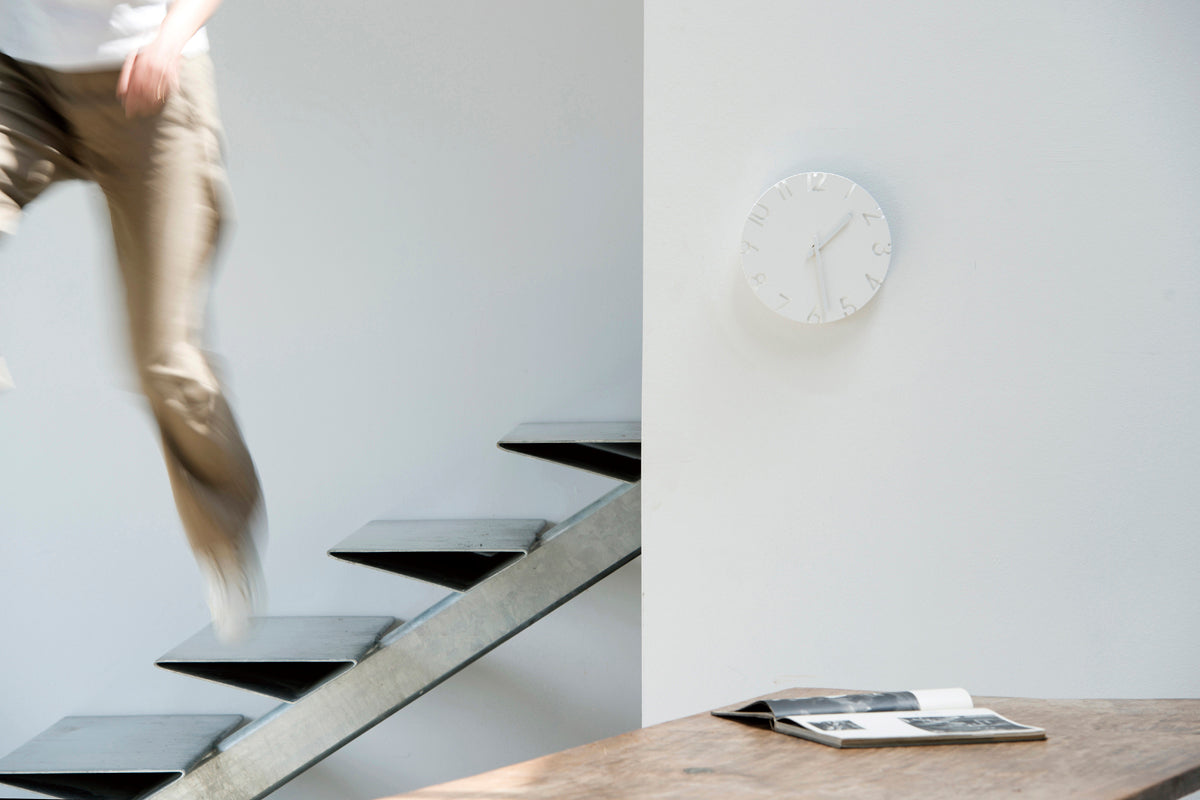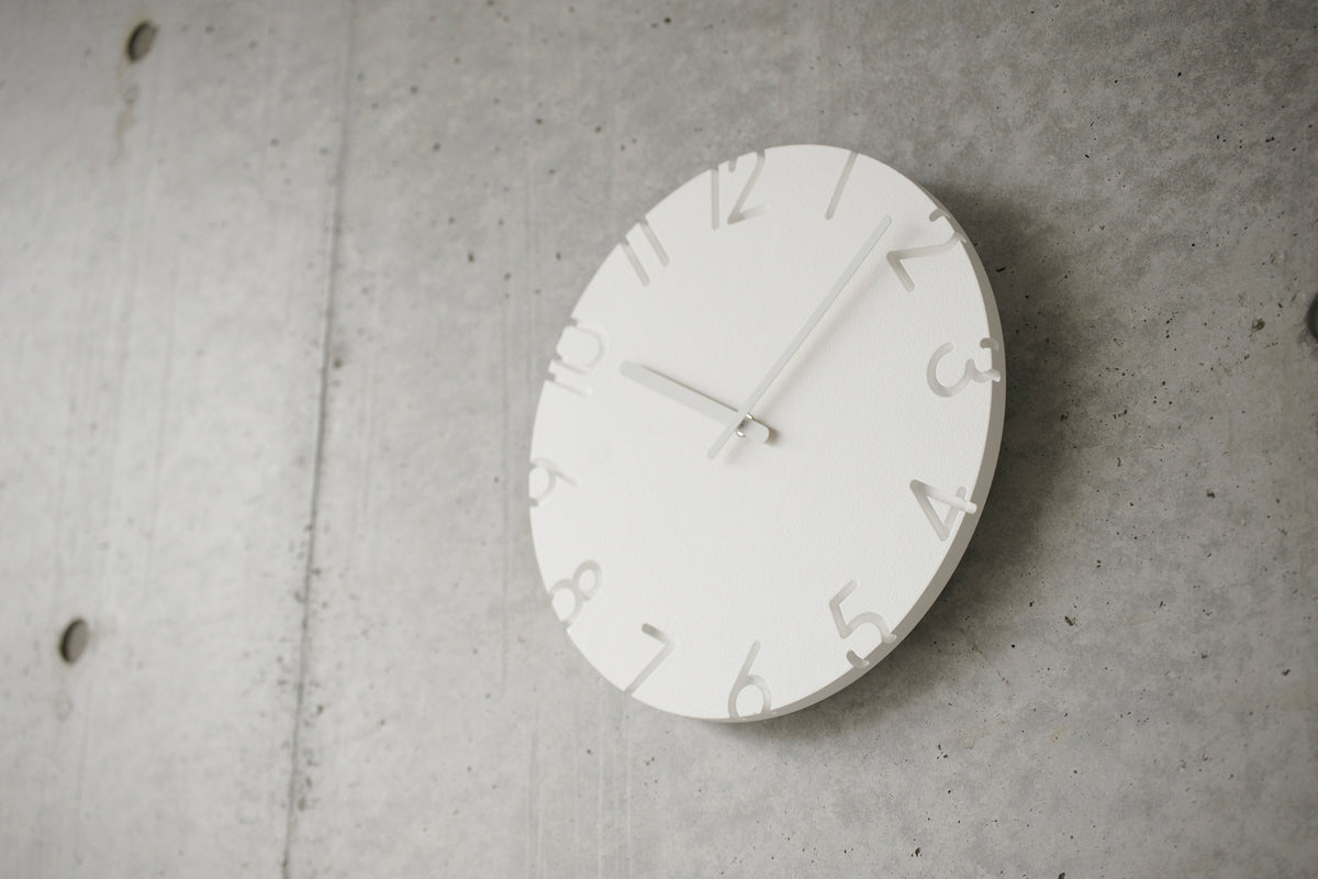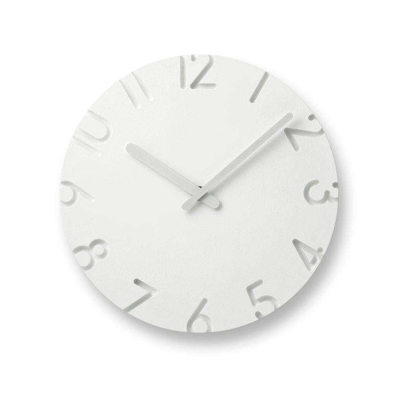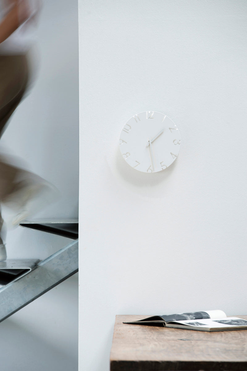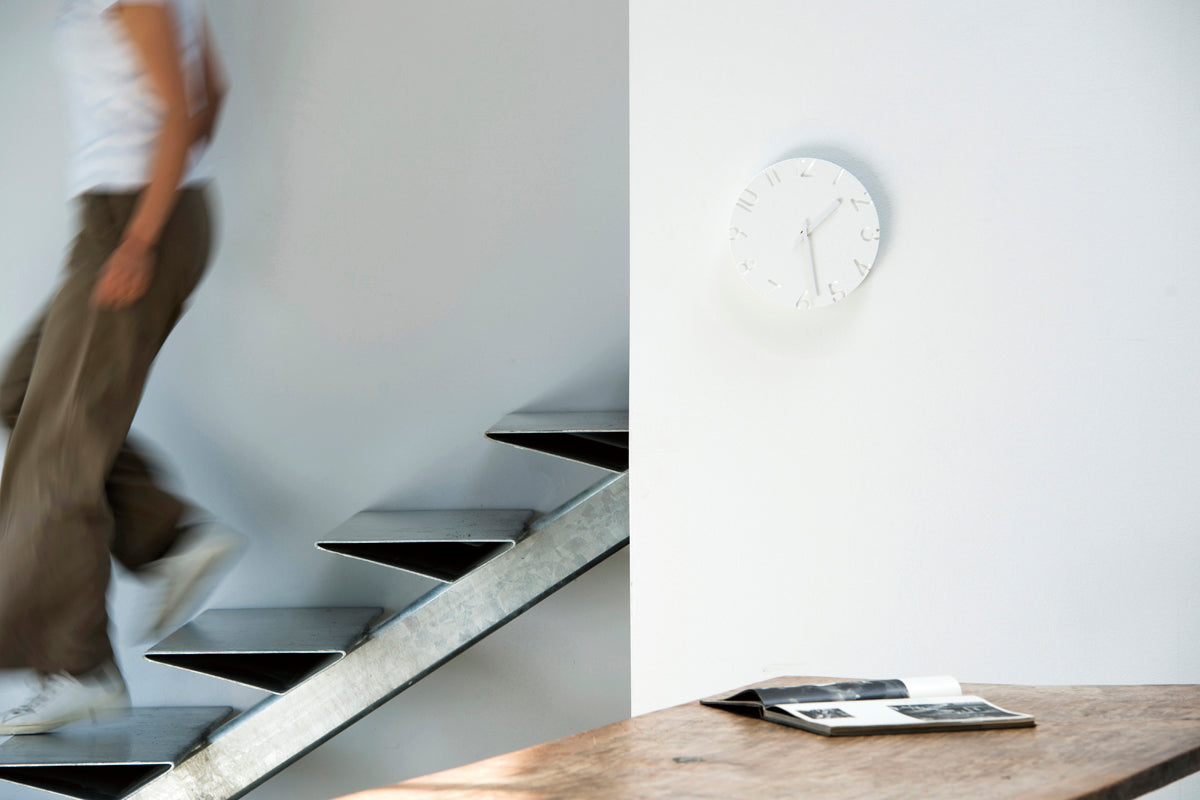 This clock, with its numbers in a chiseled-out style, attempts to treat the graphic as part of the form. The shadows of the carved-out letters bring a three-dimensional impression to the clock face, with its appearance changing in accordance with lights located in its immediate area. The idea was inspired by materials used for interior decoration and technical conversion.