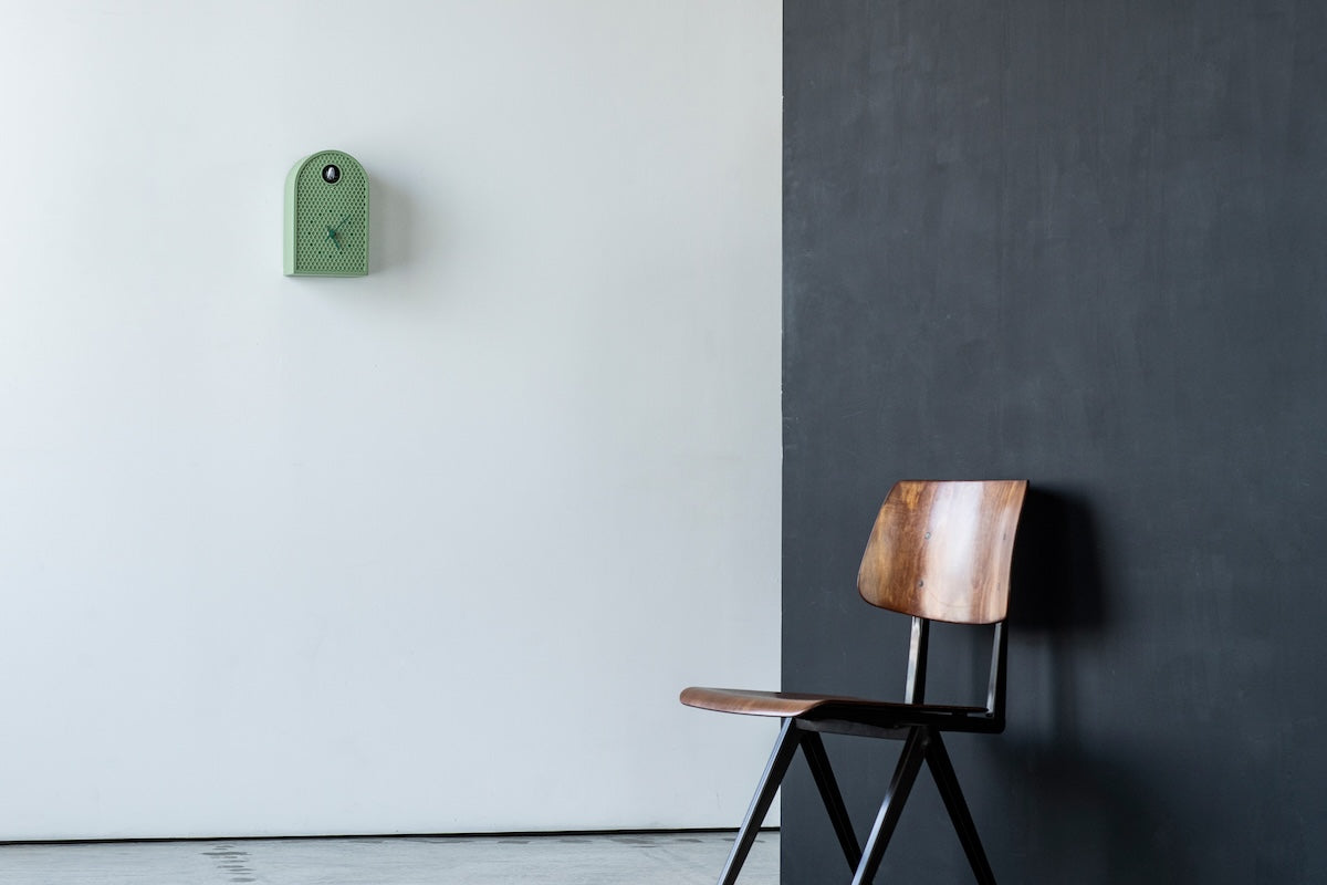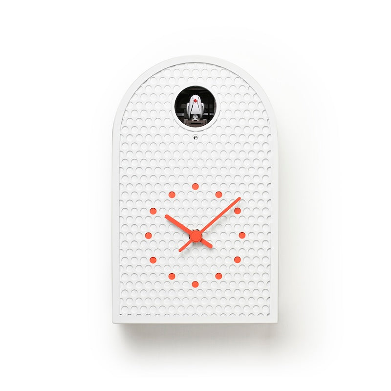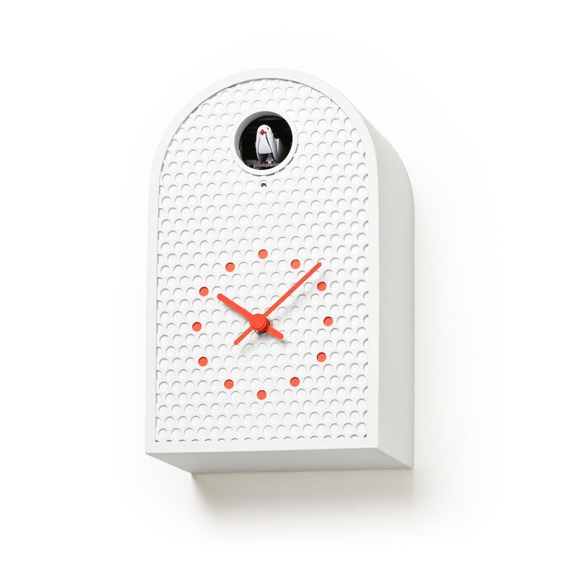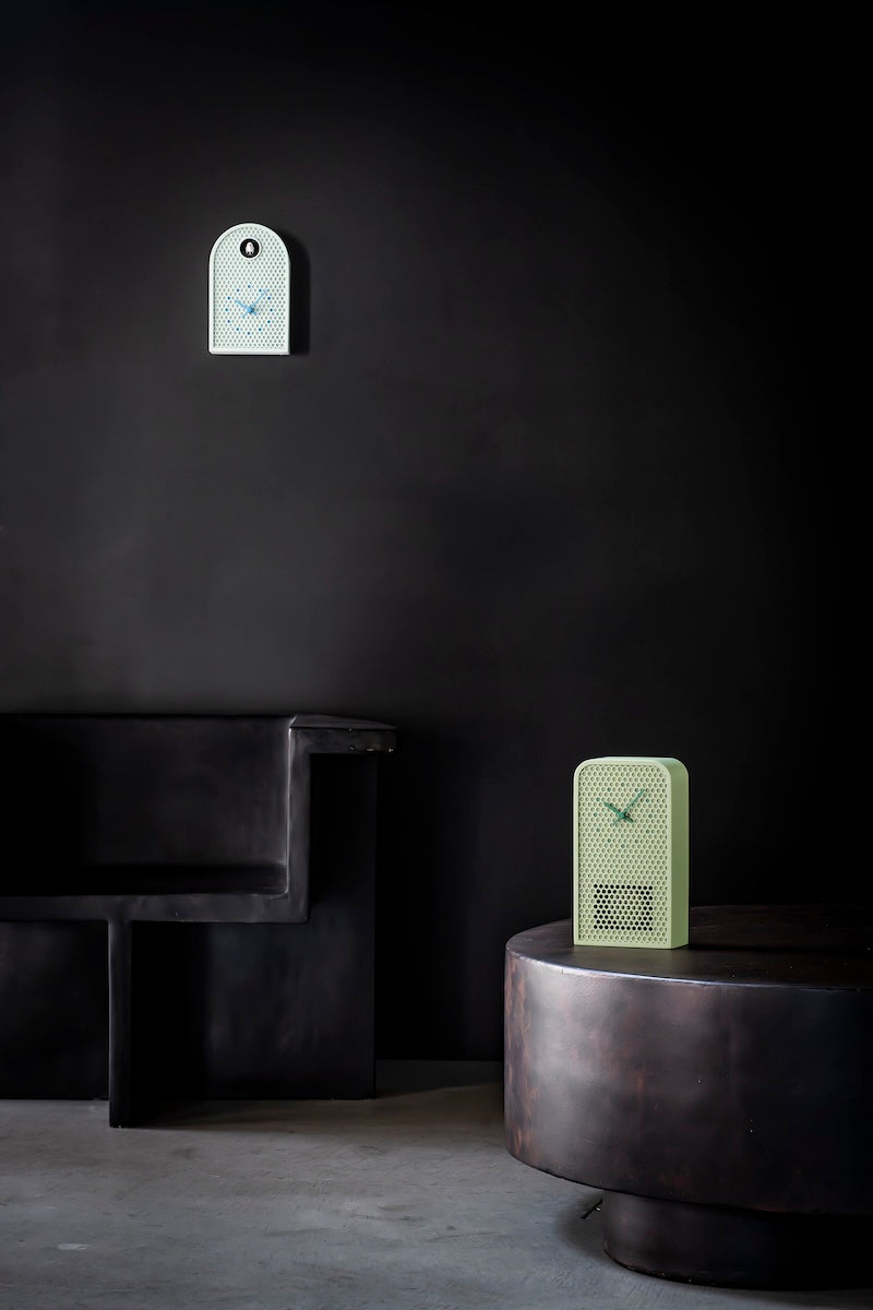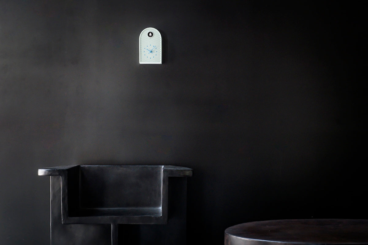 COO is a contemporary reinterpretation of the traditional cuckoo clock, crafted from perforated metal.