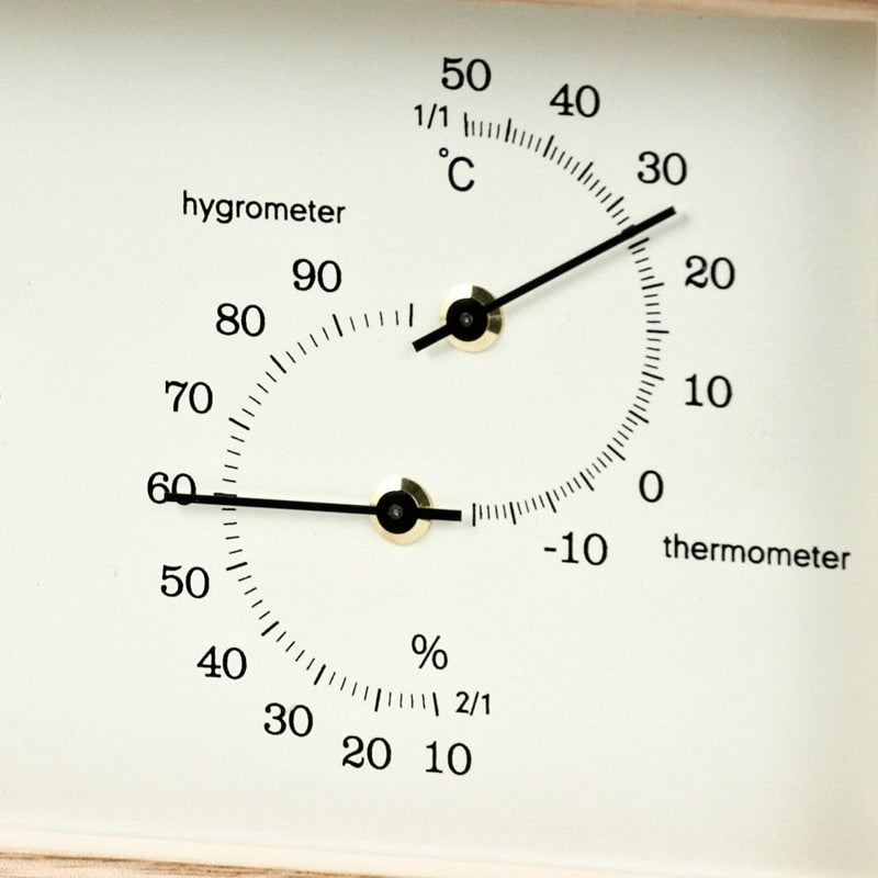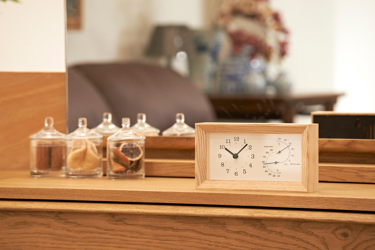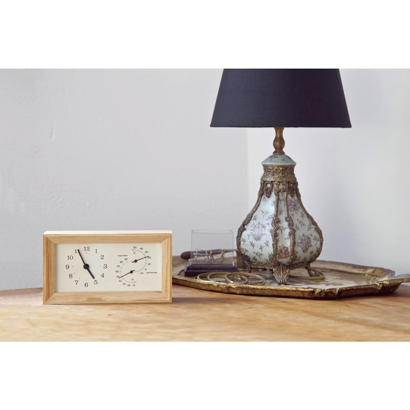 A comfortable clock for a natural taste, with a built-in thermometer and hygrometer. The clock’s simple form, with a beautiful ash grain, creates a noble atmosphere to which the miter joints add good accent. The more often you use the clock, the more charming its oil paint finish becomes.