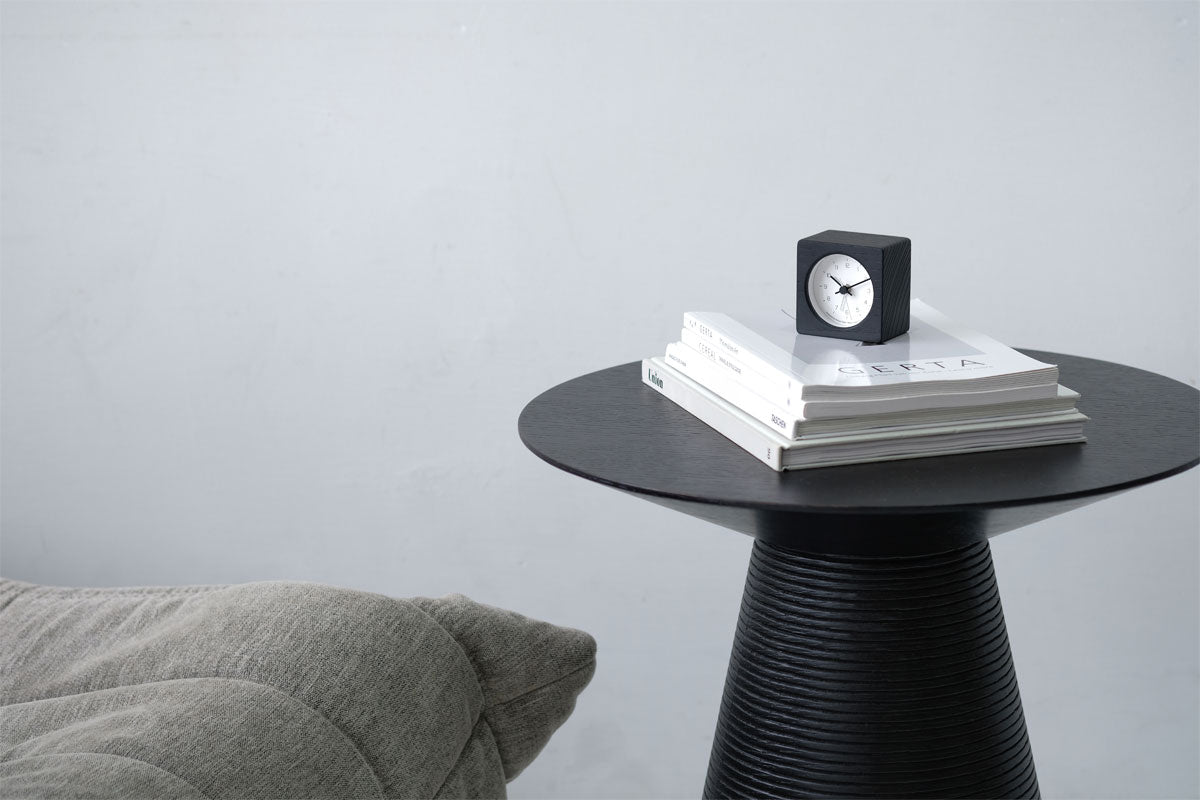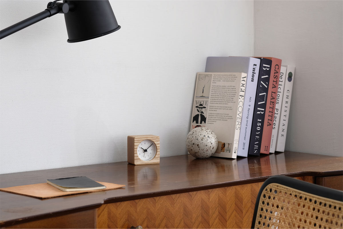 The design retains the concept of the NEUT wall clock, featuring an original font with a neutral design, to create a calm environment on a desk, bedside table, or in other small areas. The clock face has been redesigned with human proximity in mind. Along with the newly designed slender hands, it harmonizes with the thick, natural ash wood body, thereby creating a small but strong presence.
