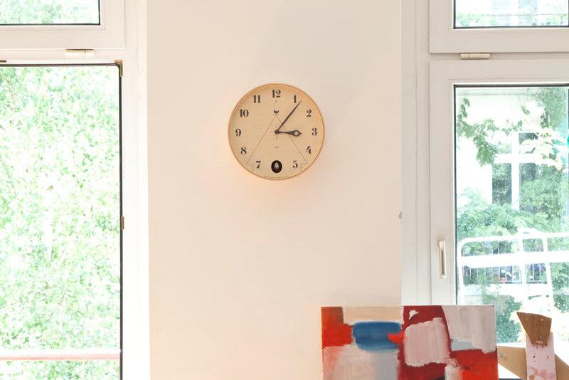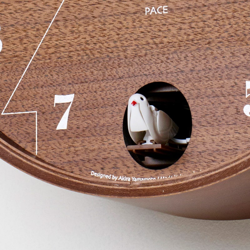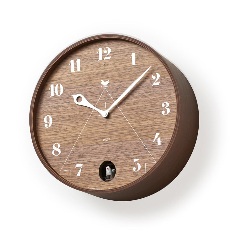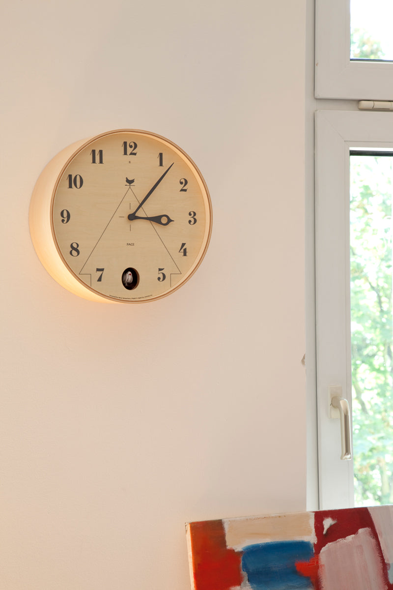 The PACE is an unconventional circular-frame cuckoo clock with the image of a birdhouse laid over the clock dial. Rendered in high-quality plywood and evoking the feel of a trompe-l’œil piece, the PACE is designed with a sense of fun in mind, from the cuckoo’s window placement in the 6 o’clock position to the bird figure motif of the clock hands.