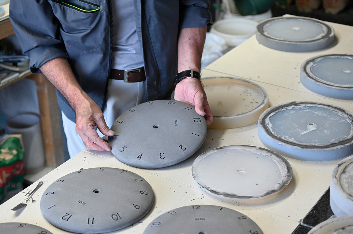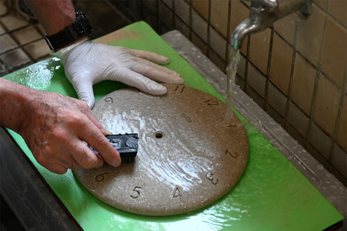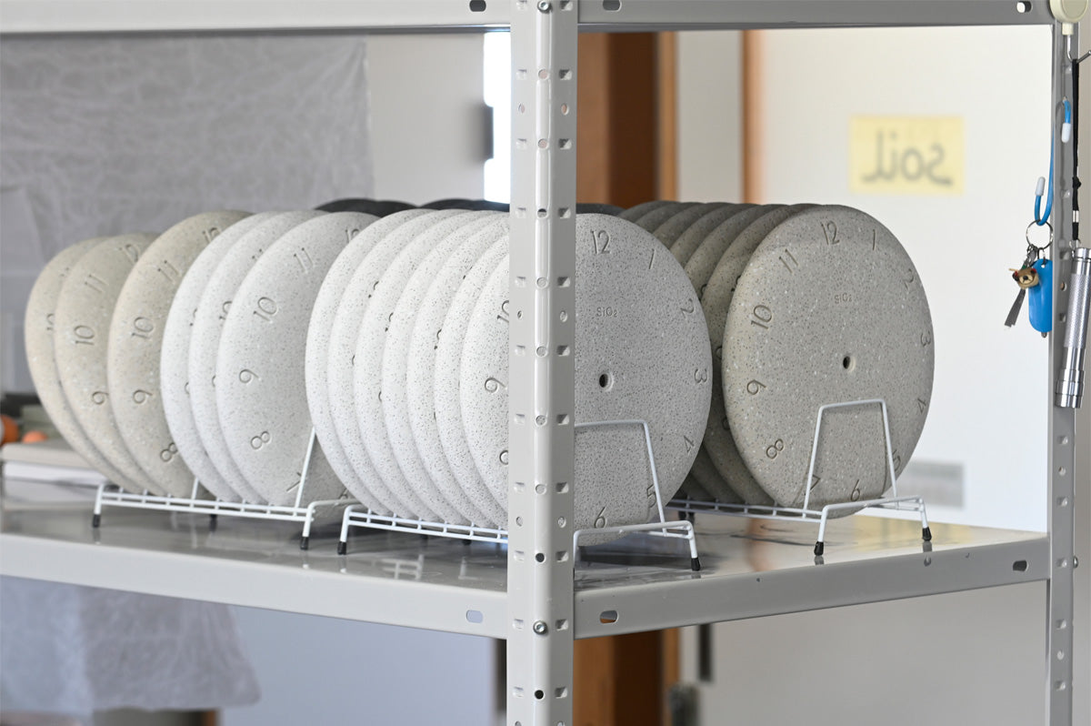 In this clock, pure white crystalline limestone aggregates, known as “Kansuiseki,” are used, which are also employed in landscaping, etc. If you examine the details, you will notice that each stone reflects light differently, giving them various expressions. The gently curving shape of the clock creates changes in light and shadow on the surface, accentuating the expression of the stone. It is very difficult to wash away the surface of the stone cleanly without destroying the edges of the numbers engraved on the clock, and the delicate handiwork of the craftsmen at “soil” has made this possible. This time, Lemnos aimed to construct a product, namely a clock, using traditional materials and techniques without excess or deficiency. There are four color variations: white (diatomite from Akita) and pink (diatomite from Noto), both of which showcase the natural colors of diatomaceous earth, along with beige and gray, the colors of which are adjusted with pigments.